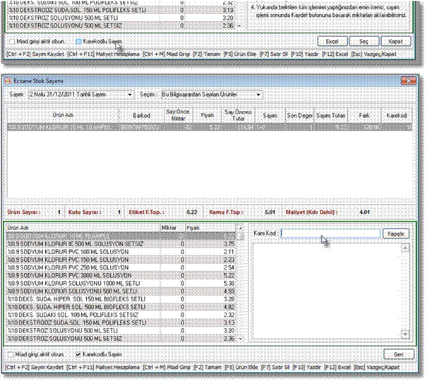 Aynı anda birçok terminalde sayım işlemini yapabilirsiniz. Bunun için önce ana makinede birkaç ürün saydıktan sonra terminal bilgisayarlardan “Eczanem Stok Sayım” bölümüne girerek aynı sayım numarası üzerine devam edebilirsiniz. Sayım bittikten sonra kaydetme işlemini ana makineden yapınız.