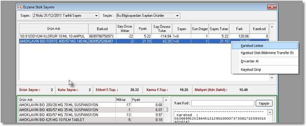 Girilen bir karekodu silmek için ürün listesine sağ tık ile Karekod Listesini açabiliriz: