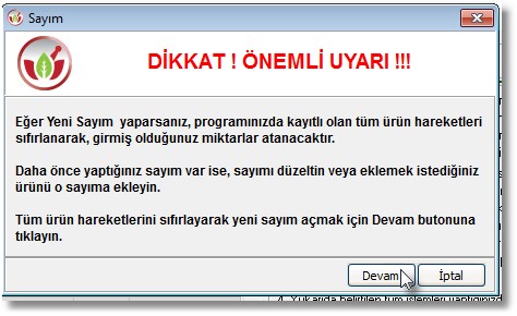 Not: Ürün hareketleriniz sıfırlanmaz. Mevcut kayıtlarınız aynen olduğu gibi kalır. Sayım işlemi sadece stok değerlerinizi düzeltir.