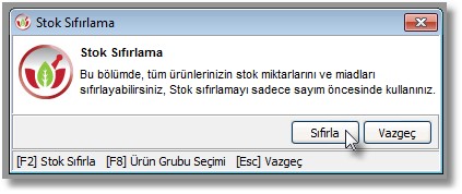 10. Stok Sıfırlama ekranında “Sıfırla” butonuna tıklayalım: